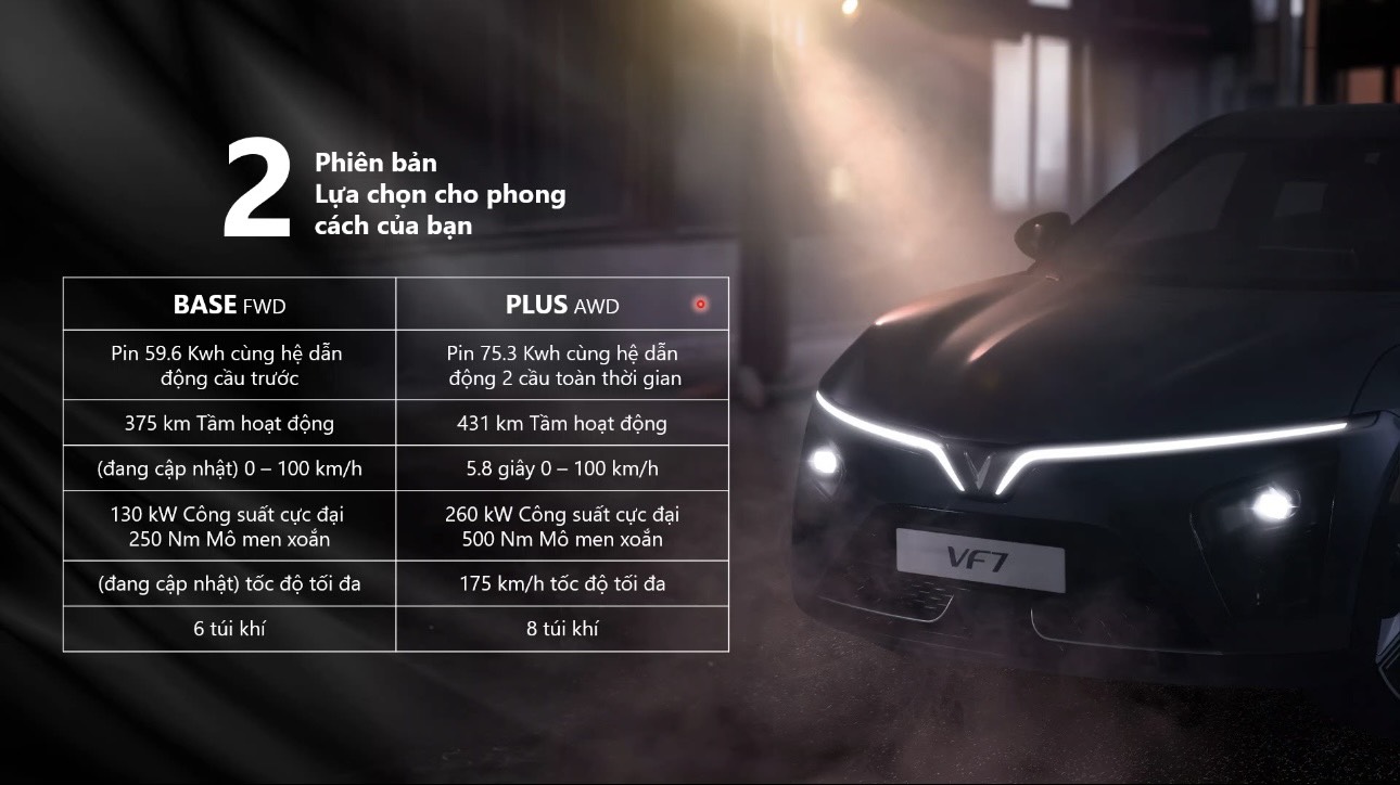 Dự kiến sẽ có 2 phiên bản VinFast VF7 và VinFast VF7 Plus. Tương tự như các mẫu xe điện khác của VinFast, VF 6 và VF 7 có đầy đủ các chức năng an toàn chủ động và thụ động cùng chế độ bảo hành 10 năm cho xe, 10 năm hoặc trọn đời cho pin (không giới hạn số dặm), cùng các dịch vụ bảo dưỡng, cứu hộ di động, sửa chữa linh hoạt 24/7.
