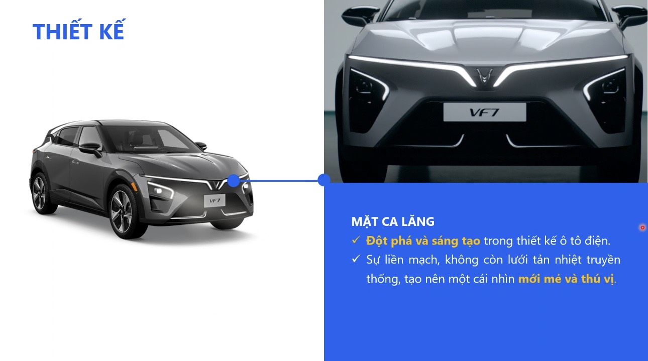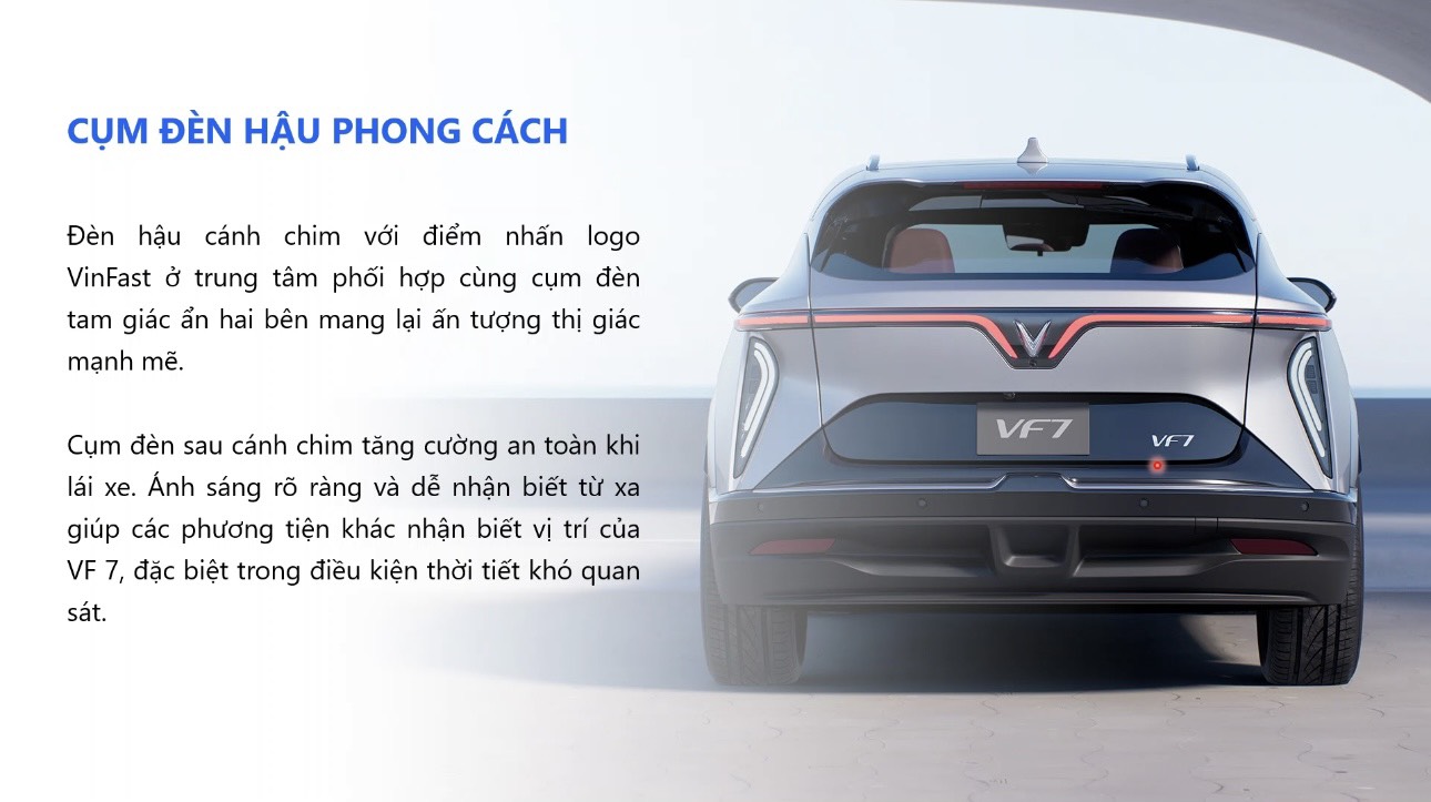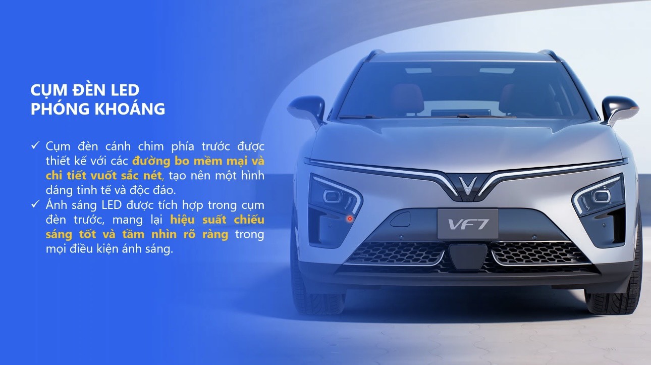 VF 7 thuộc phân khúc xe cỡ trung, có kiểu dáng tiên phong, sáng tạo kết hợp với thiết kế nội thất đề cao trải nghiệm lái và công nghệ hiện đại. Mui xe vuốt thấp mang đến vẻ đẹp thể thao khỏe khoắn, cùng các đường nét táo bạo ở đuôi xe với cụm đèn LED hình cánh chim vút bay phóng khoáng. Đặc biệt, cụm đèn trước mang dấu ấn VinFast với hiệu ứng LED độc đáo càng làm nổi bật phong cách mạnh mẽ và hiện đại.